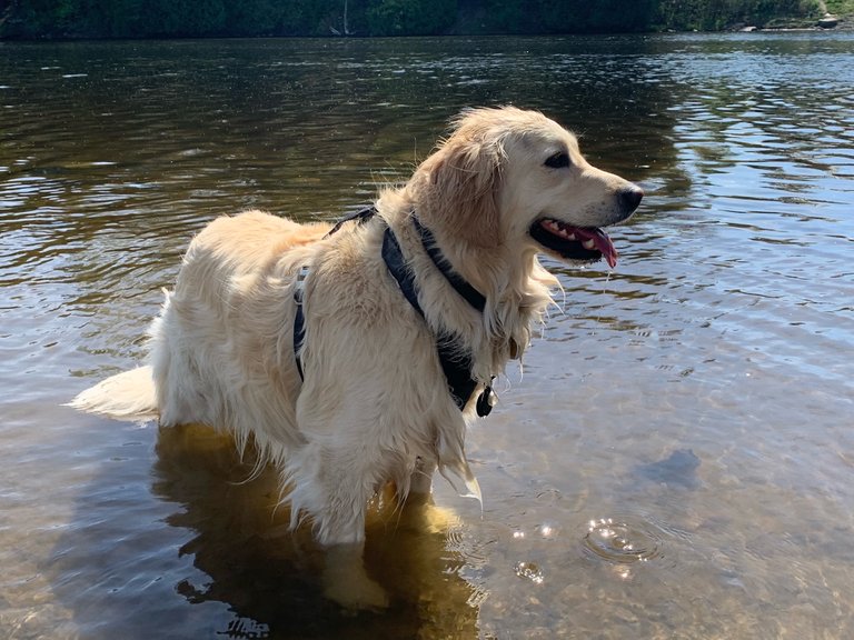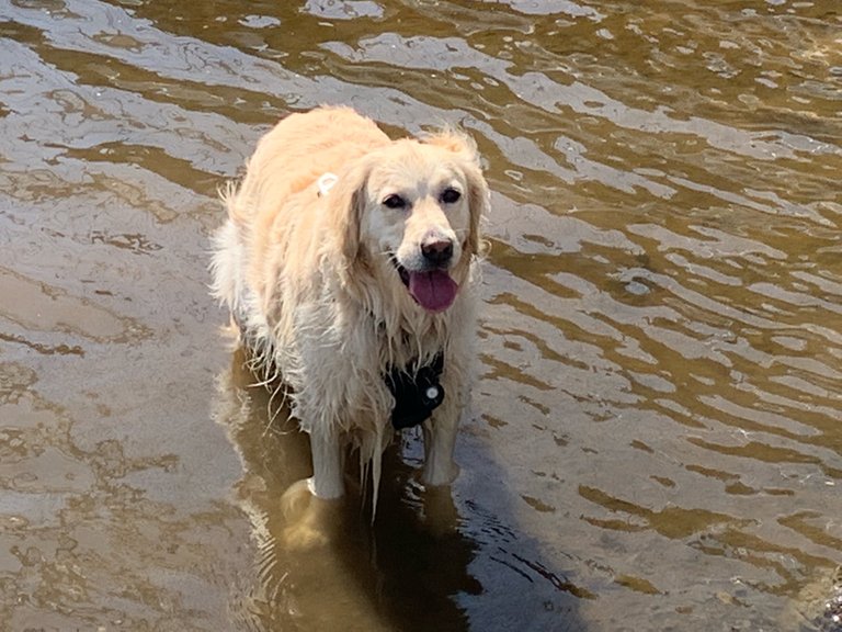 Soaking wet and planning to roll in the mud once on shore.