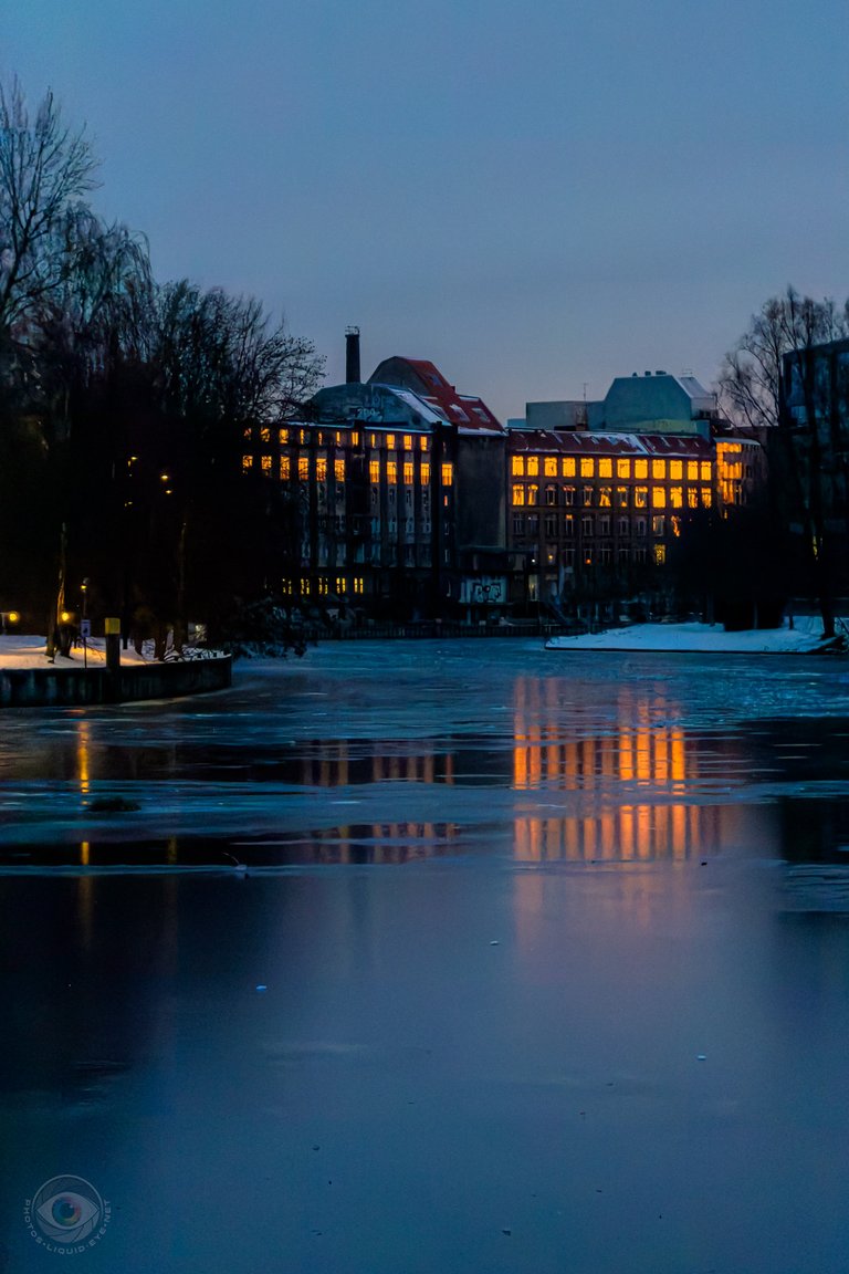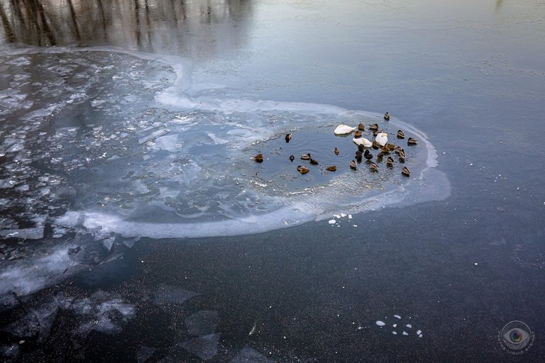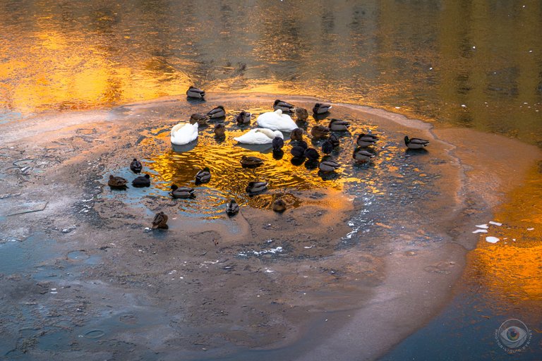 It was very cold again, but dry, around -9 degrees in the morning, with a fiery sunrise, and I walked the Luiseninsel round with interval walking. I also did breathing and meditation exercises again with a view on the ice. According to the weather forecast, it should get warmer again starting tomorrow, in other words, the wet thaw is upon us. At the Palace Bridge, I encountered a whole group of different birds sharing the last unfrozen piece of the Spree, and of course I brought back some pictures for you.