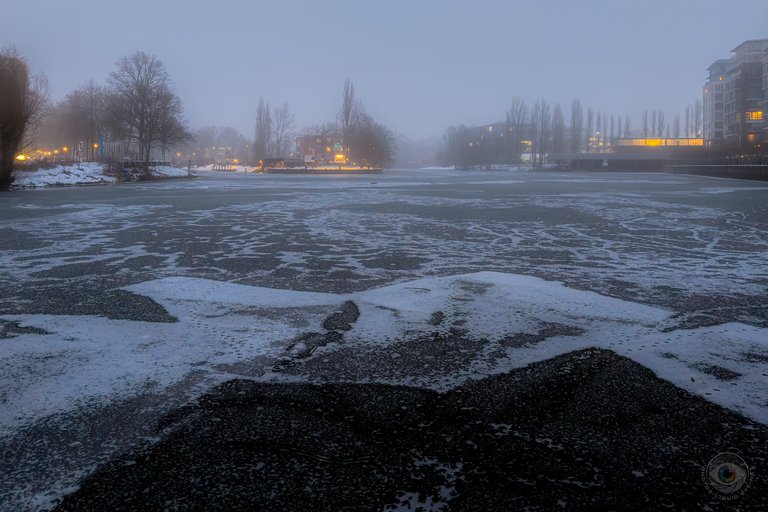 Still cold, but only around 0 degrees now, so the thaw is setting in, accompanied by a little fog this morning. No interval walking through the palace gardens because it is closed today for safety reasons. So instead, breathing and meditation exercises with a view of the slowly thawing ice on the Spree and a multi-bridge walk. According to the weather forecast, temperatures are now set to rise daily, so it will be cold enough to catch a cold, so caution is advised. I captured the gloomy, wet and cold mood this morning at my starting point, which looks different every day. Plus more ice and some birds on ice.