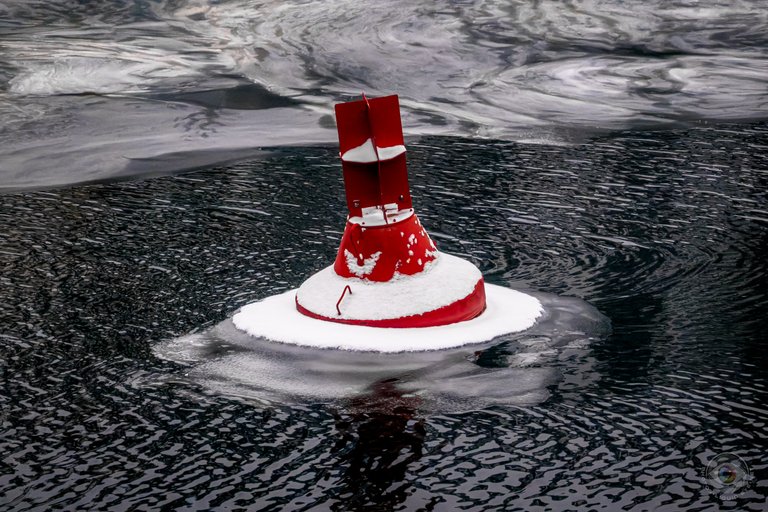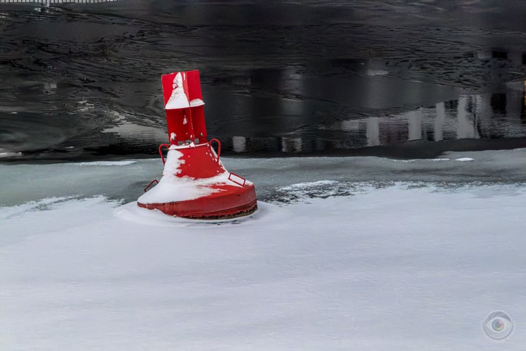 Another Siberian morning at around -9 degrees Celsius, and it snowed last night. Winter wonderland again, and windy too, making it feel even colder again. It was very slippery because the fresh snow hid the ice that was already everywhere, making it difficult to see where you were stepping. Interval walking was therefore hardly possible. In any case, I enjoyed a few short breathing exercises on the banks of the increasingly icy Spree on my walk across some of its bridges. The motif of the day is icy buoys, which convey the current mood here quite well.