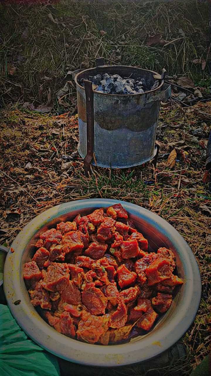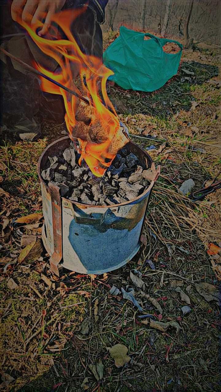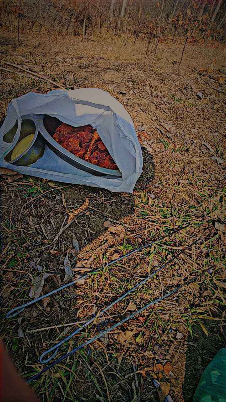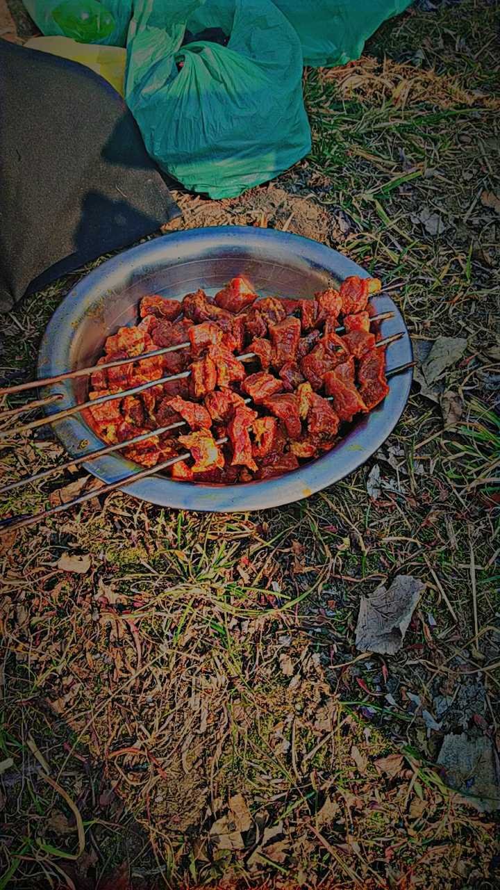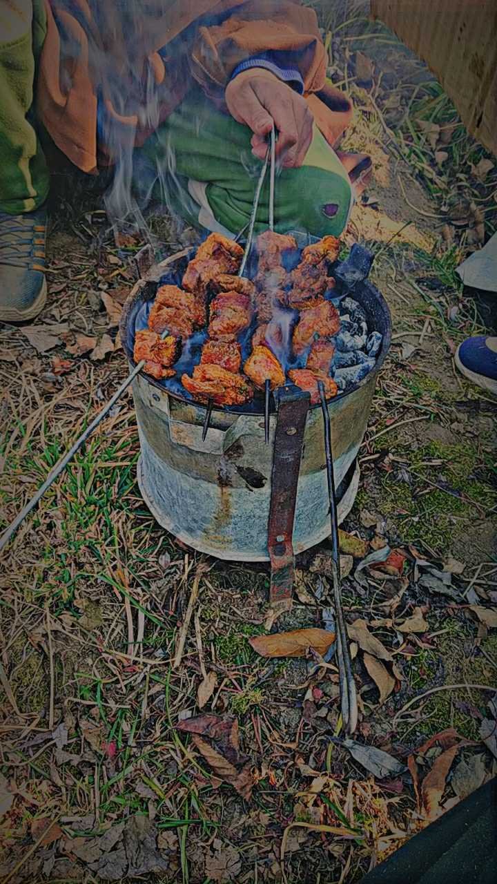 Hello everyone. I'm having fun with some of my friends while cooking barbeques in an orchard. It's something which cannot be cooked in kitchen. It is an outdoor thing.