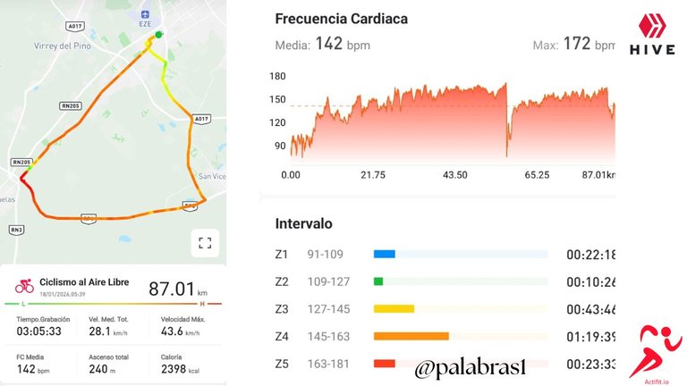 142 bpm de frecuencia media y una máxima de 172 bpm, habla de que gran parte del trayecto estuve trabajando en zona 4 y por momentos tocando zona 5. Muy buenas sensaciones realmente y me llena de satisfacción todo el trabajo que venimos realizando. Cuando trabajas con un entrenador que tiene experiencia en el área, todo cobra mayor significancia y eso, que esto todavía está en etapa de construcción. Según el mismo, lo sabroso vendrán en los meses de febrero y marzo.