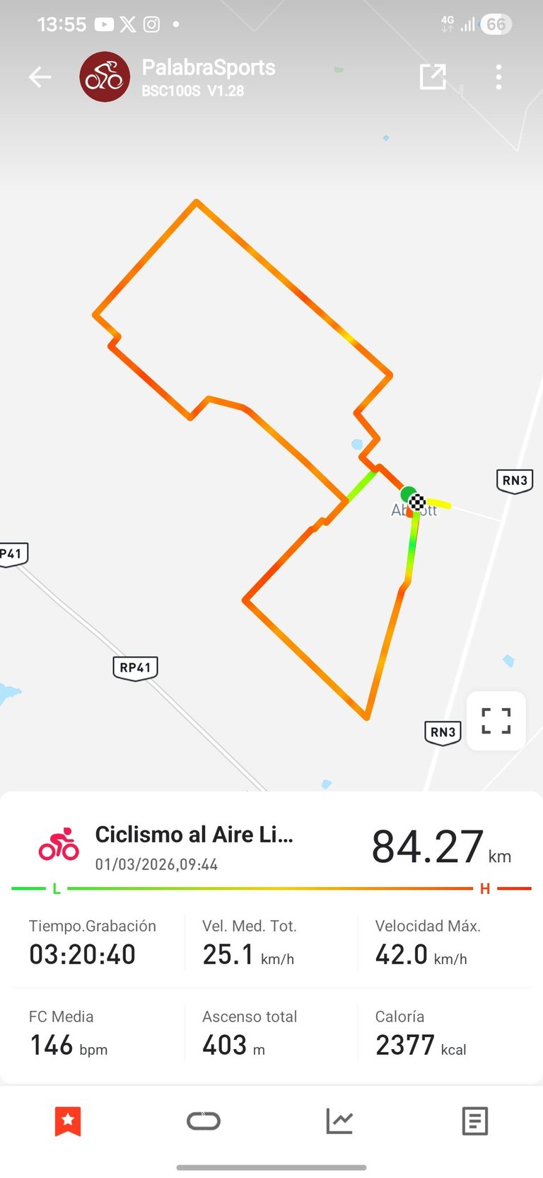 El reporte de la aplicación marca 84 km, porque la entrada en calor también estuvo inmersa en la misma. Olvidé poner la computadora de cero en el momento de la largada. Una gran experiencia realmente volver después de muchos años en las competencias y a seguir entrenando para próximos eventos que se viene. Tarea pendiente, mejorar la transmisión de la bicicleta, ya que es fundamental en terrenos con mucho polvo donde la cadena se reseca yi tiende a cortarse .