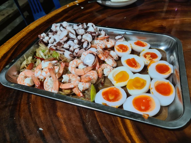 Whole day of hard work ends with a tray of Thai style papaya salad with onsen eggs and a lil seafood as toppings!