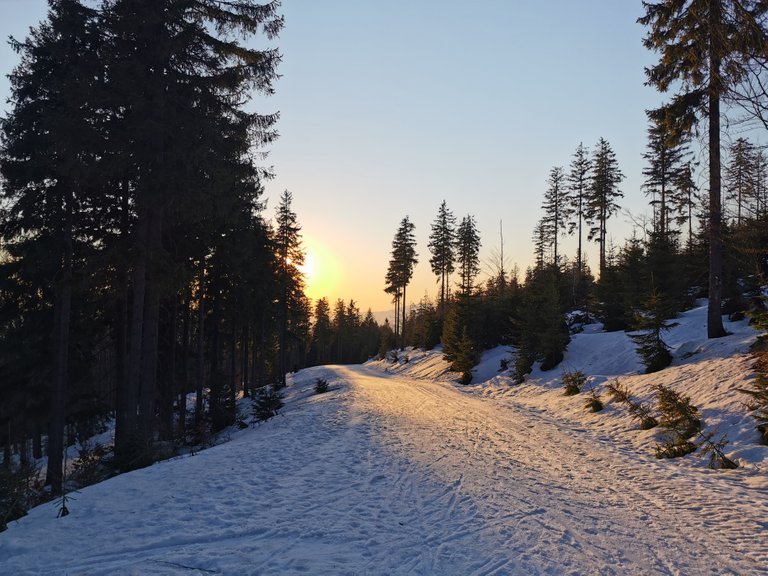 Teraz biegłem po szlaku schowanym w lesie, więc śnieg był mocno przedeptany i ubity przez turystów, dzięki czemu był dużo bardziej twardy.