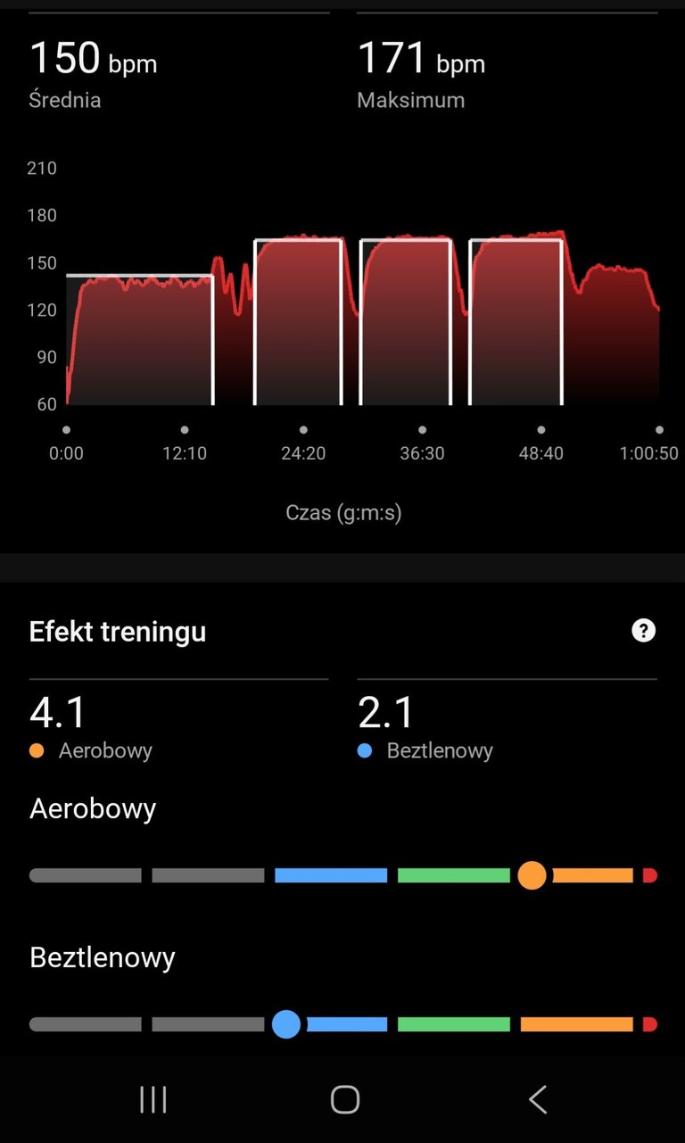 Każdy z odcinków zaczynałem nieco szybciej, po czym korygowałem prędkość w momencie, gdy tętno zbliżało się do górnej granicy. Dzięki temu przez większość czasu utrzymywałem stabilną pracę w okolicach progu, bez niepotrzebnego wchodzenia w wyższe strefy.