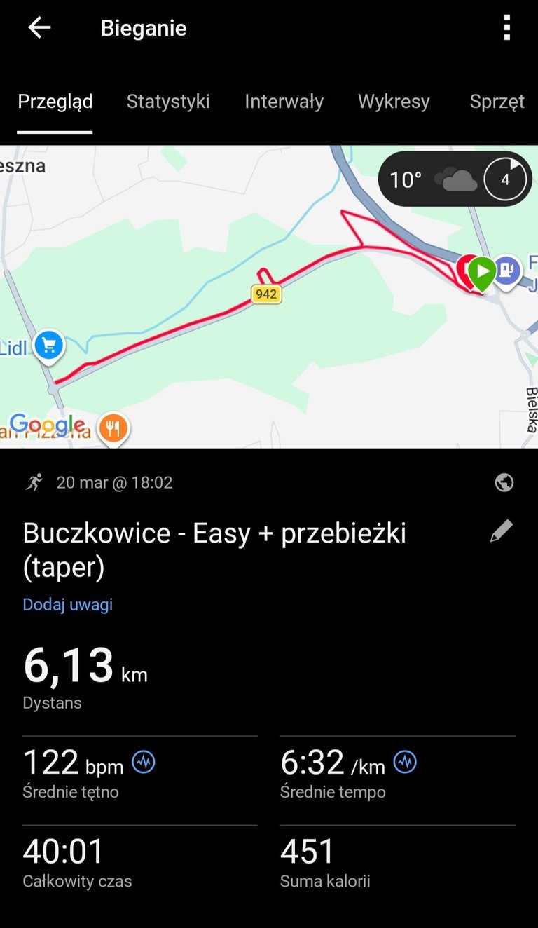 Na koniec 4 przebieżki. Pierwsze dwie wejście w rytm, trzecia – wyraźne „kliknięcie”, poczułem moc i lekkość biegu. Czwartą już kontrolowałem, żeby nie przesadzić i zostawić świeżość na start.