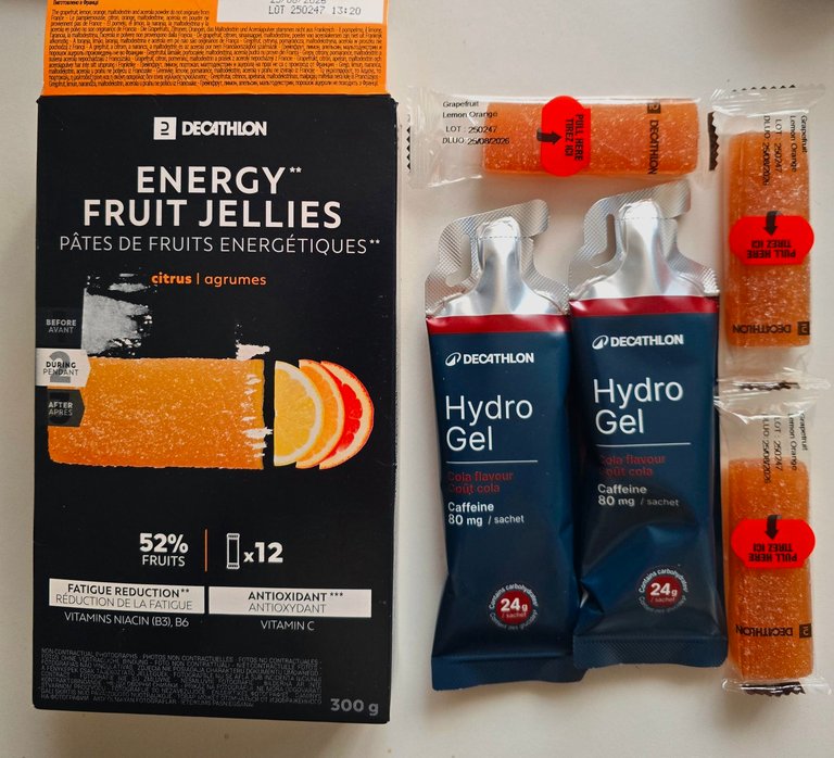 W niedzielnym biegu będą mnie wspierać produkty z Decathlon – żele i galaretki energetyczne. Plan jest prosty i dopracowany:
