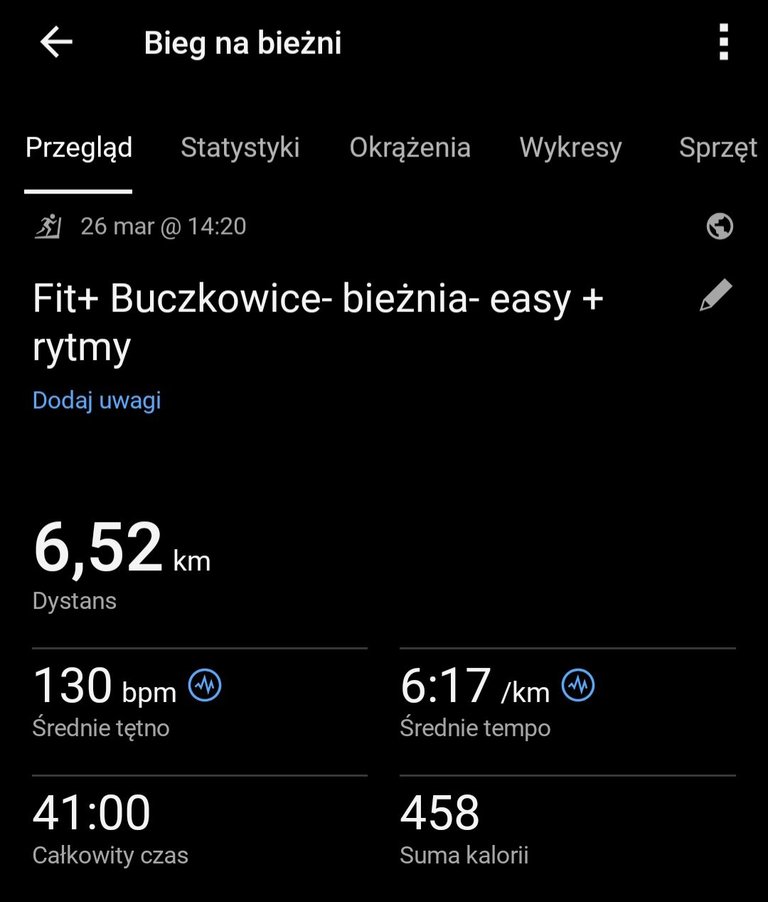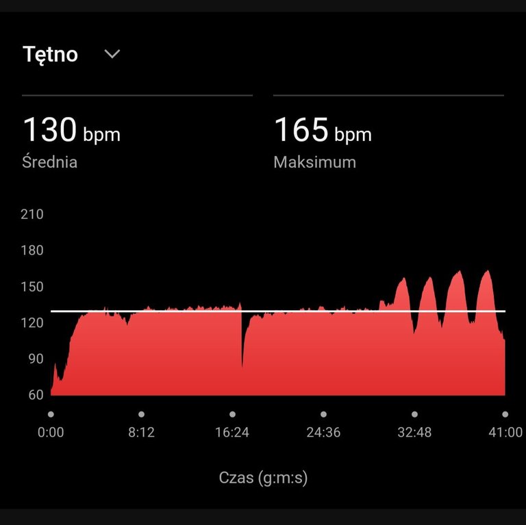 40 minut spokojnego biegu na bieżni mechanicznej. Tętno trzymane w ryzach — średnio 130 bpm, czyli czysta strefa tlenowa. Bez szarpania, bez ambicji na tempo. Po prostu budowanie bazy, cegła po cegle.