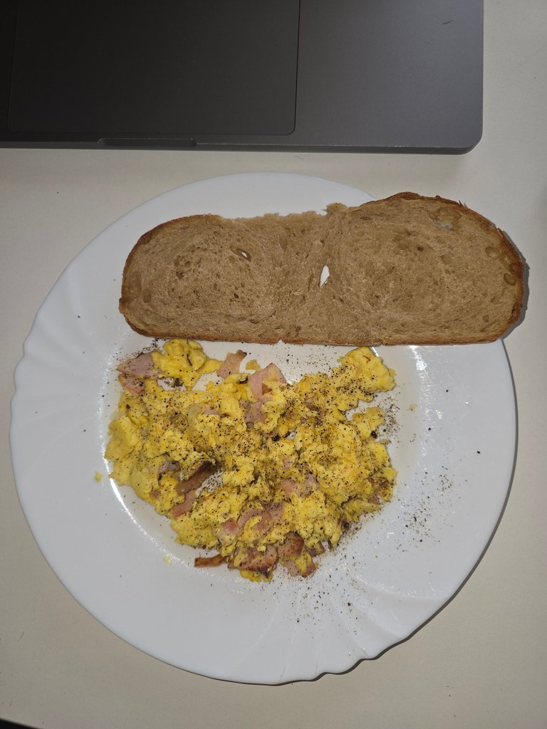 Morning started simple but solid — scrambled eggs with bread.