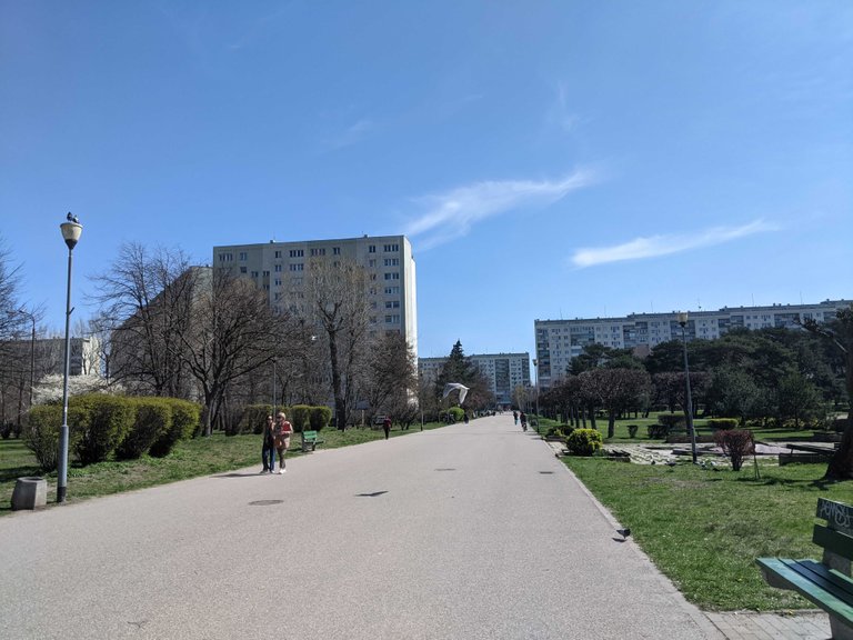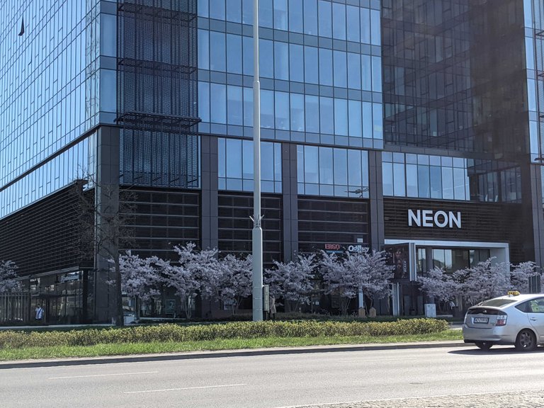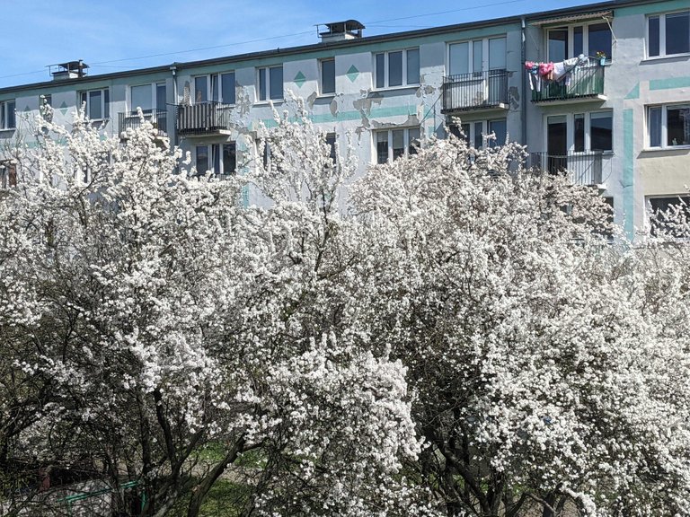Ależ te kwitnące drzewa wyglądają! Na ławeczkach pod nimi ciągle jakieś sesje zdjęciowe. Gdańsk, ul. Grunwaldzka w pobliżu Kołobrzeskiej