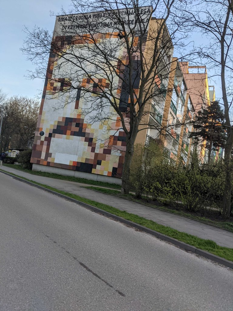Tu mieszkał Lecha Wałęsa i teraz ma taki mural. Niewyraźność tego muralu niespecjalnie mu się podobała
