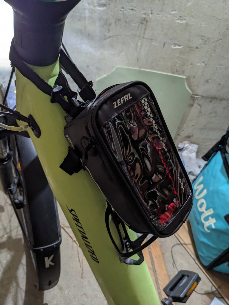 Druga rzecz to buty — śniegowce, które również świetnie się spisały. Wokół padało, a ja miałem ciepłe i suche stopy. Kolejną nowością było etui na telefon, zawieszone przy pasku. Sprawdziło się zaskakująco dobrze, mimo że dostęp do ekranu podczas jazdy był mocno ograniczony. Musiałem więc pamiętać trasę i czasem zatrzymać się, szczególnie już pod domem klienta, żeby upewnić się co do numeru bloku czy klatki. Sama obsługa ekranu przez dwie warstwy folii okazała się jednak możliwa, co otwiera nowe możliwości w deszczu — dotychczas był to największy problem.