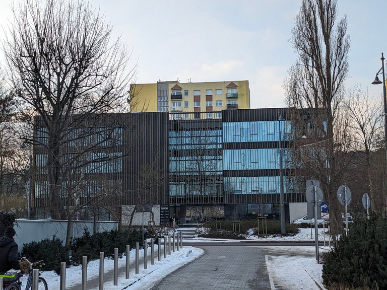Zdjęcie z okolic sopockiego Lidla a na zdjęciu biurowiec z drzewem po środku. Ciekawie się tam wjeżdża windą