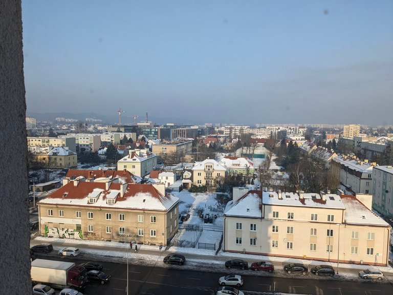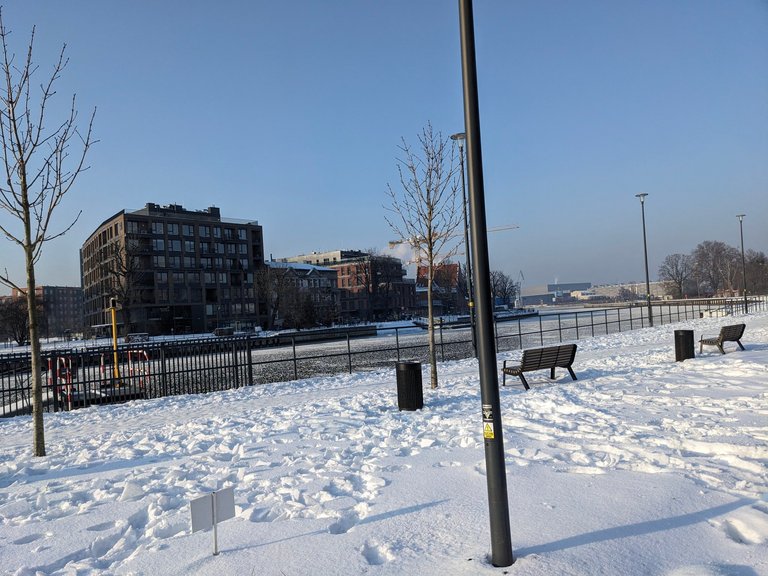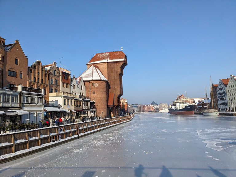 Mimo wszystko warto wspomnieć o jednym miłym elemencie dnia. Jeździłem wczoraj również po centrum Gdańska. Przejażdżka wzdłuż Motławy była ciekawa wizualnie. Zabytkowy, historyczny Gdańsk — dawny port, dziś kamienice nad rzeką — w tej pogodzie wyglądał wyjątkowo. Motława była częściowo oblodzona, a miejscami płynęła rozdrobniona kra, czyli śryż. Widok był naprawdę interesujący.