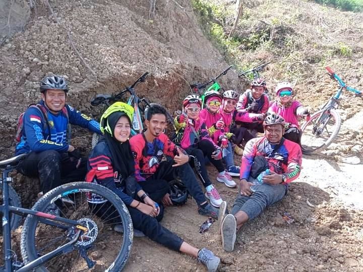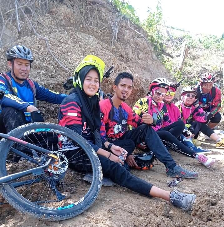 Berolahraga bersepeda bersama teman-teman di puncak gunung.