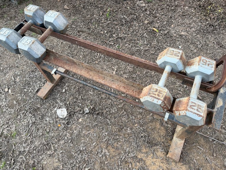 Yesterday I cut down a very long and very heavy dumbbell rack, and today I cut down some thinner angle iron and 1" round to 44" to make a much lighter and shorter rack.