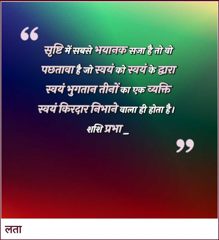 सृष्टि में सबसे भयानक सजा है तो वो पछतावा है जो स्वयं को स्वयं के द्वारा स्वयं भुगतान तीनों का एक व्यक्ति स्वयं किरदार निभाने वाला ही होता है।