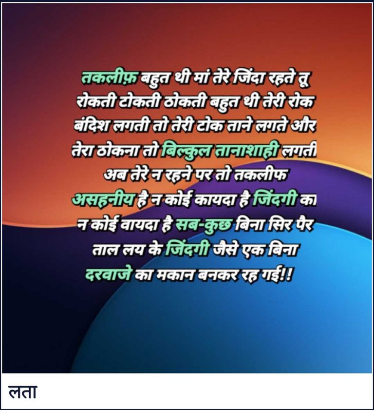 तकलीफ़ बहुत थी मां तेरे जिंदा रहते तू रोकती टोकती ठोकती बहुत थी तेरी रोक बंदिश लगती तो तेरी टोक ताने लगते और तेरा ठोकना तो बिल्कुल तानाशाही लगती अब तेरे न रहने पर तो तकलीफ असहनीय है न कोई कायदा है जिंदगी का न कोई वायदा है सब-कुछ बिना सिर पैर ताल लय के जिंदगी जैसे एक बिना दरवाजे का मकान बनकर रह गई!!