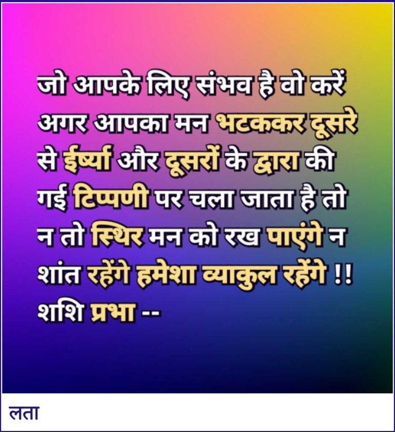 जो आपके लिए संभव है वो करें अगर आपका मन भटककर दूसरे से ईर्ष्या और दूसरों के द्वारा की गई टिप्पणी पर चला जाता है तो न तो स्थिर मन को रख पाएंगे न शांत रहेंगे हमेशा व्याकुल रहेंगे !!