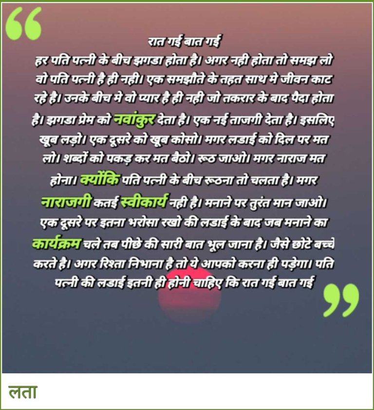 हर पति पत्नी के बीच झगडा होता है। अगर नही होता तो समझ लो वो पति पत्नी है ही नही। एक समझौते के तहत साथ मे जीवन काट रहे है। उनके बीच मे वो प्यार है ही नही जो तकरार के बाद पैदा होता है। झगडा प्रेम को नवांकुर देता है। एक नई ताजगी देता है। इसलिए खूब लड़ो। एक दूसरे को खूब कोसो। मगर लडाई को दिल पर मत लो। शब्दों को पकड़ कर मत बैठो। रूठ जाओ। मगर नाराज मत होना। क्योंकि पति पत्नी के बीच रूठना तो चलता है। मगर नाराजगी कतई स्वीकार्य नही है। मनाने पर तुरंत मान जाओ। एक दूसरे पर इतना भरोसा रखो की लडाई के बाद जब मनाने का कार्यक्रम चले तब पीछे की सारी बात भूल जाना है। जैसे छोटे बच्चे करते है। अगर रिश्ता निभाना है तो ये आपको करना ही पड़ेगा। पति पत्नी की लडाई इतनी ही होनी चाहिए कि रात गई बात गई