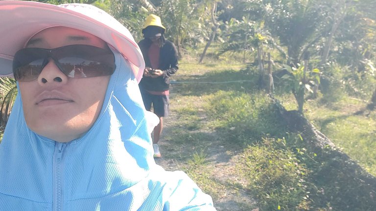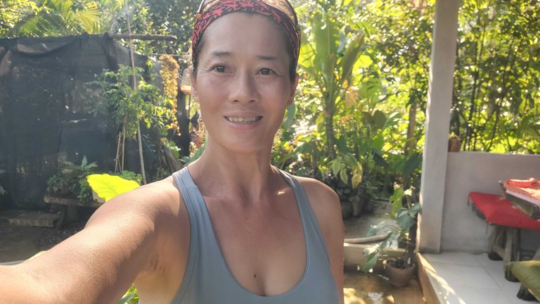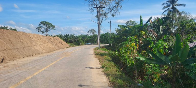 I told my husband many times until I told him that I ordered shoes for my husband to exercise this time. And today, I was excited that my husband came to exercise with me. My exercise place is the same place. I walked out of my garden through a natural path. The atmosphere is surrounded by old rice fields. There are cows and pigs of the villagers and birds that live in nature. Such as egrets, crows and other birds. They chirp like every day. The sound is natural. When I walked to the concrete road, I stopped at a white house to feed the fish. In a small pond that I kept. Then I headed up the concrete road. Started by walking to warm up for about 200 meters. Then I ran. Today, the weather is very hot. Now it's about 9:20 am. Along the way, the concrete road is quiet. I ran for exercise today. In a fairly large round, I usually run 5-6 rounds. I will reach my goal of 10,000 according to the Actifit App system that controls exercise. But in conclusion, I didn't turn on my phone. Today was a big mistake, but it's okay. It's considered more exercise than before. Increase my strength. So I started again. Walking and running as usual. But this time I walked more than running. The time went quite fast. In addition to exercising on the concrete road With the hot weather, I wanted to invite my husband to exercise along the Trang River. But today, the construction workers came to work in many places in this area, so I didn't want to disturb them or go jogging in that area. Because it seems that today the construction workers and contractors...It seems like they are in a hurry to work, so I decided to run on the concrete road, which is quieter.