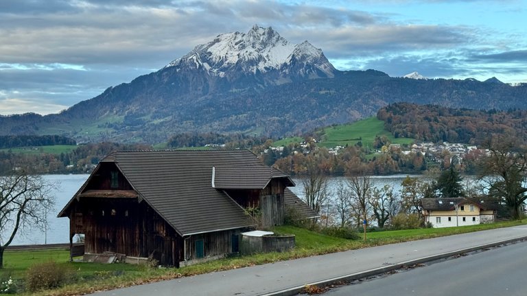 Zasněžený Pilatus focen jen z auta cestou do dřiny.
