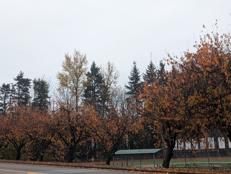 Well, today was wet and gray. The trees have gone from vibrant to looking kind of dead. But I still have to walk the dog.
