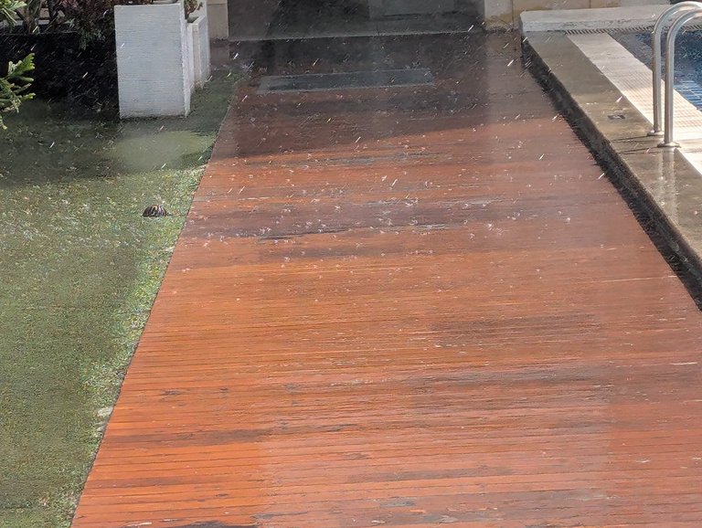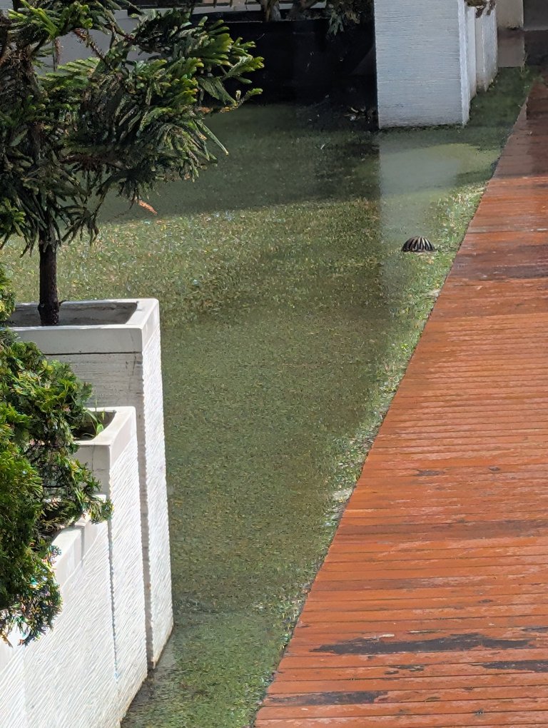The rain was flying in sideways and bouncing off the ground. After just a few minutes there were puddles on the ground. Didn't really want to go out in that. Sure I had an umbrella but still.... No thank you.
