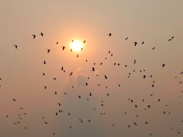 I was on the road. It was a 3 km long journey towards my campus. Suddenly these birds arrived and I stopped some time here. It seems they are moving towards the sun.