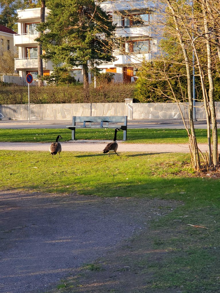 Had a long day driving to Elimäki and back to Helsinki. Aki was asking to go out I took an evening walk to meet the local geese on the Munkkaniemi waterfront.