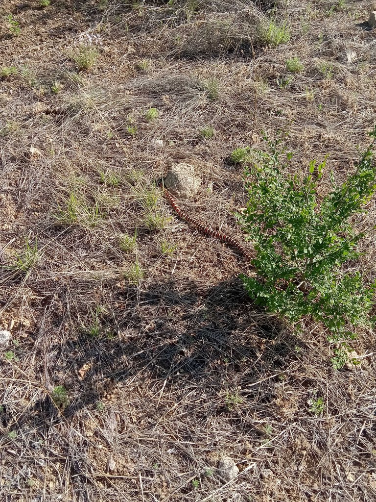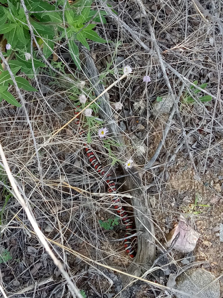 Non-poisonous and harmless but very beautiful but they didn't like my interruption and quickly slithered off into the bushes.
