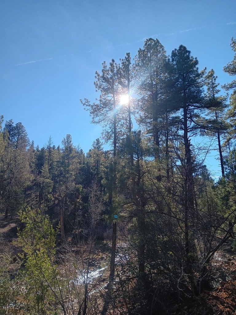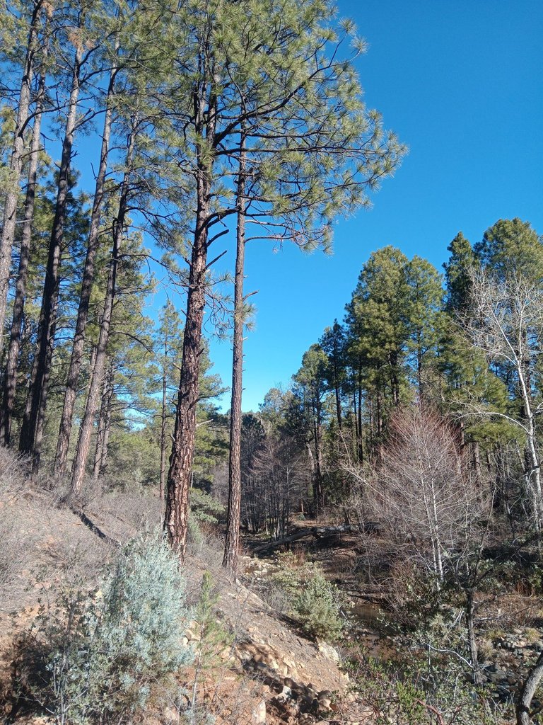 We covered a good 2+ miles before crossing over the shallow creek and heading back higher up on the hillsides under the tall pines before finishing up with almost 4 miles.