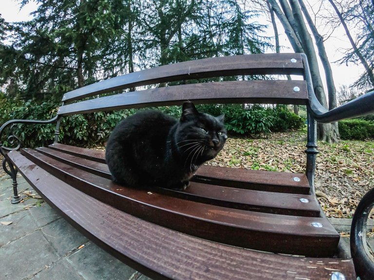 A black cat posed happily in front of my gopro lens.