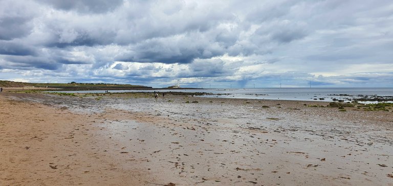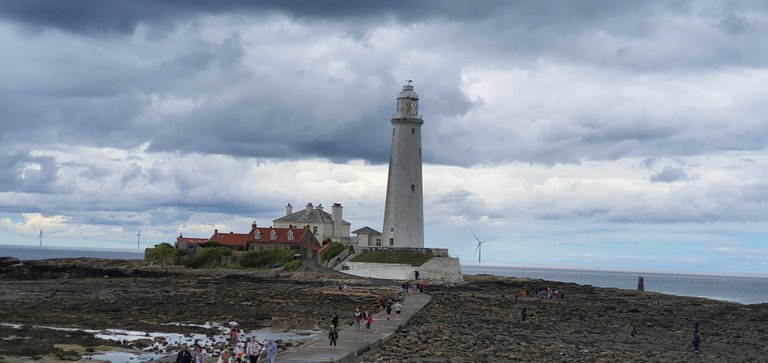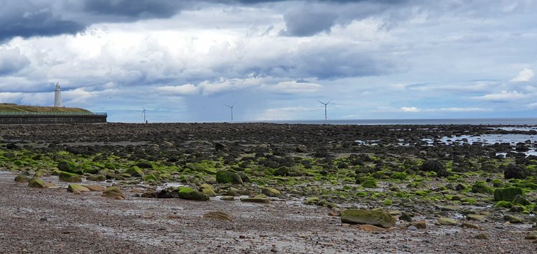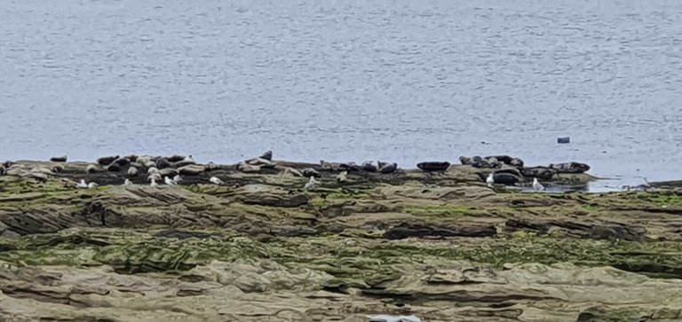 The weather was cloudy but it wasn't cold. We walked out to St. Mary's Lighthouse which stands at the end of the bay on an outcrop of rocks. Its quite impressive. There we see some seals on the rocks. You can just see them in the photo below.