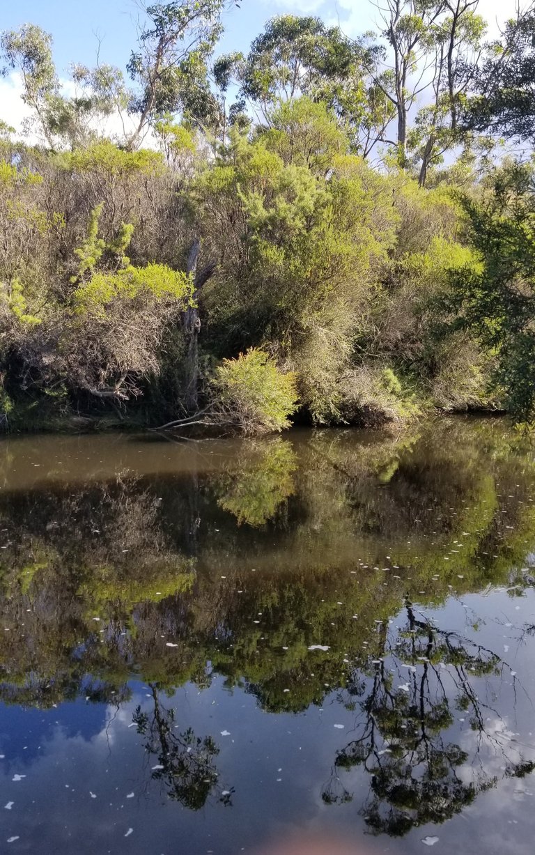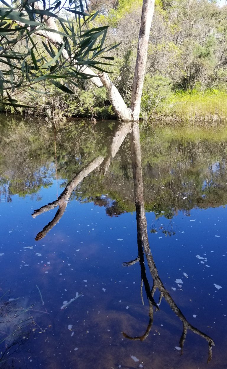 Reflections in the still water above the falls
