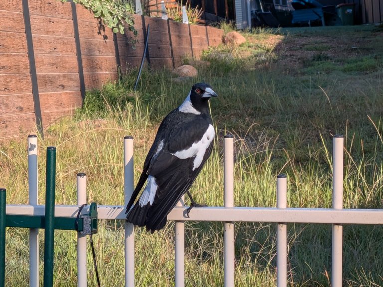 Thankfully, I got a welcome distraction along the way. I had an Australian Magpie down to my left, on the ground, happily singing as I approached it. Then, to my surprise, another flew in front of me and landed on my right side, in the fence.