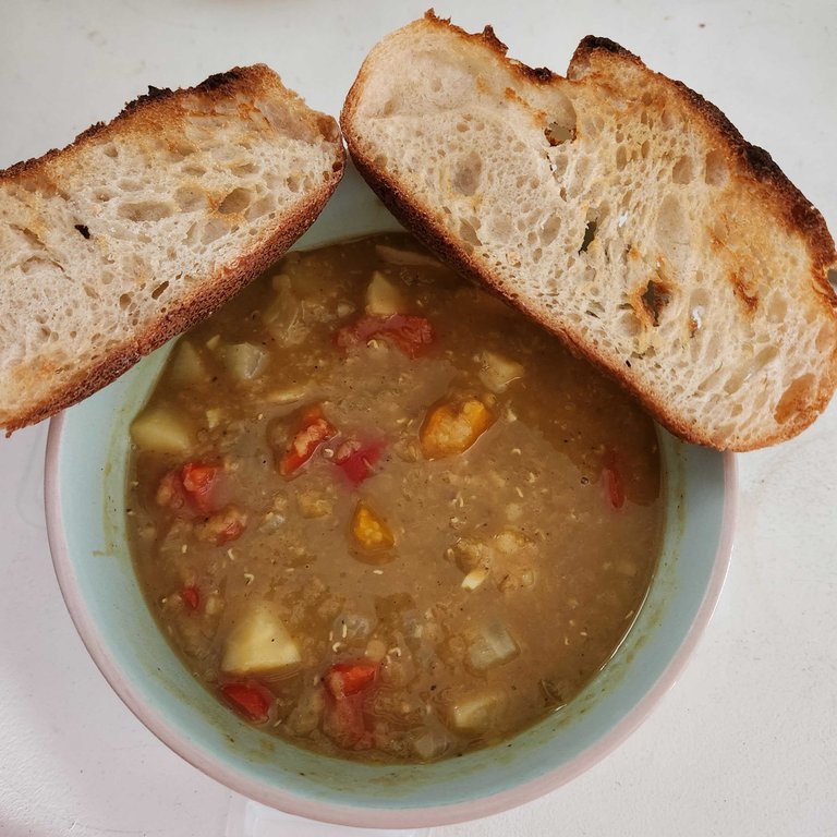 Sunday, I woke up around noon and made sure my Fantasy (american) Football rosters were ready for action. Then I warmed up some of the delicious vegetarian lentil soup I had cooked up the day before. Today, I remembered to take a picture. Red lentils, turnip, parsnip, and sweet bell peppers make this a tasty way to start the day, along with some sourdough toast. I also finished the meal with a juicy red grapefruit!