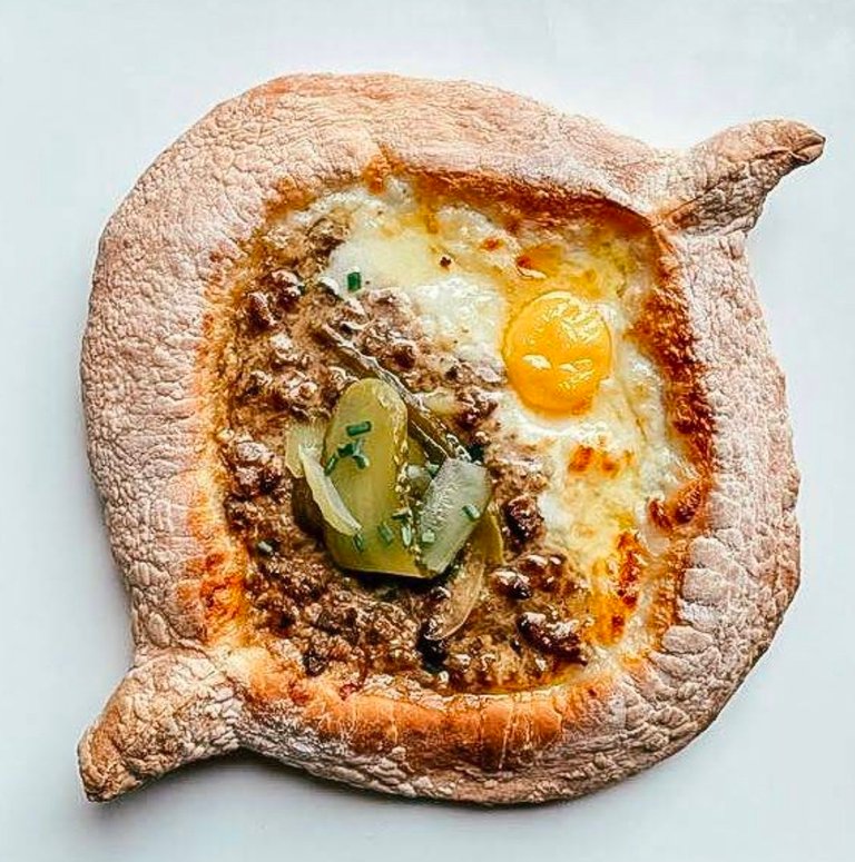 Adjaruli khachapuri is a traditional Georgian cheese bread from the Adjara region, shaped like a boat, filled with a molten cheese mixture, and topped with a raw egg and a pat of butter, which are stirred in before eating to create a rich, creamy dip for the crust. It's a hearty, iconic dish often symbolizing hospitality, with the egg yolk representing the sun over the Black Sea.