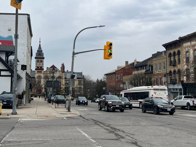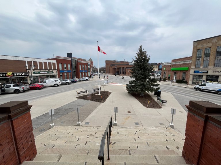 On the other side of city hall, looking north, the snow is indeed gone but the flowerbeds are a while from exploding with colour.