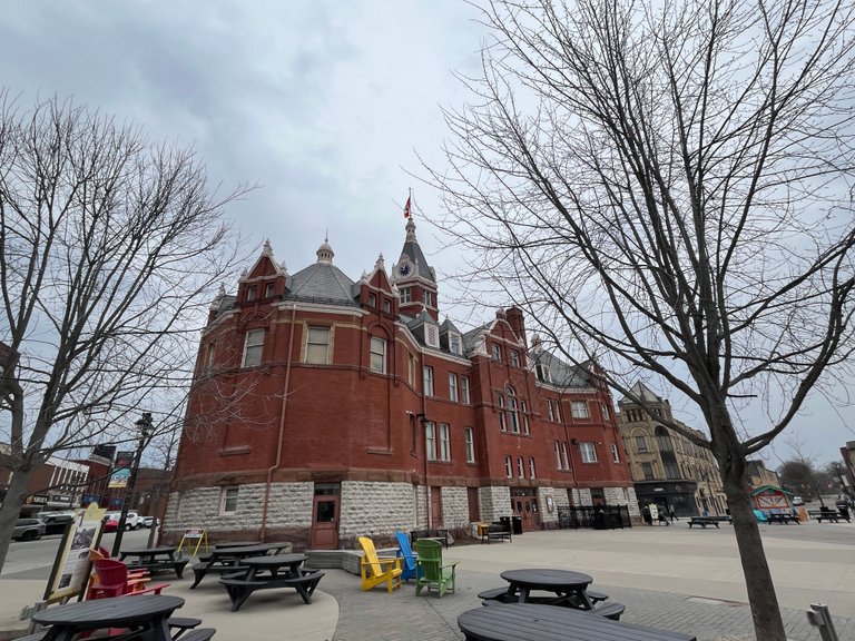 Looking up at city hall, the trees are still bare but should soon be showing buds of new growth. Maybe a long winter and spring will make for a long summer.